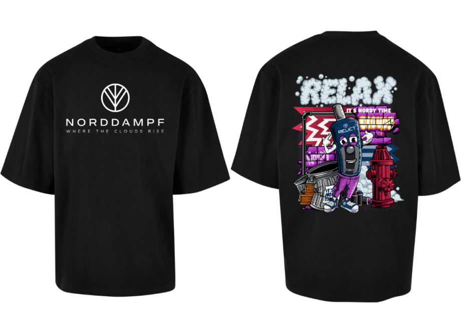 En la parte delantera brilla el elegante Norddampf, sencillo y con estilo: «Where the Clouds Rise». ¿Y la parte trasera? ¡Es impresionante! El mismísimo Nordy Nord, relajado en un entorno urbano: con paredes cubiertas de grafitis, bocas de incendio y mucho ambiente callejero. Un motivo que grita: «Relájate, es la hora de Nordy», perfecto para todos aquellos que no solo quieren vapear, sino también dejar huella.