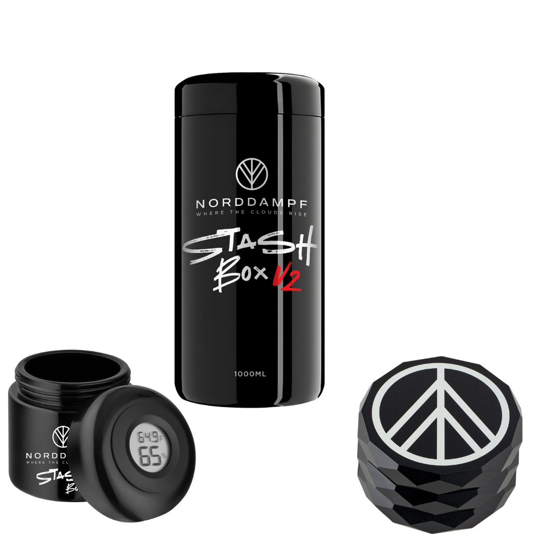 Das Norddampf Stash Bundle kombiniert die bewährte Stashbox V1 (500 ml) mit der V2 (1000 ml) aus hochwertigem Mironglas und integriertem Hygrometer. Dazu gibt’s einen praktischen 3-teiligen Grinder – alles für frische und optimale Kräuterlagerung.