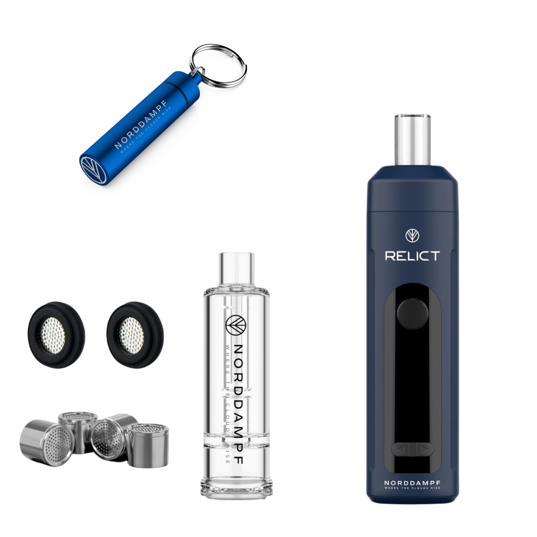 Das Relict Bundle kombiniert den hochwertigen Vaporizer (schwarz oder blau) mit Bubbler, stylischem Capsule Caddy inklusive 4 Dosierkapseln und 2 langlebigen Silikonsieben – für maximale Flexibilität beim Dampfen.